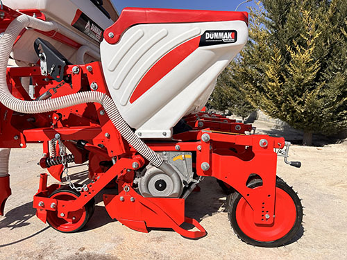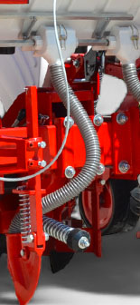Pnömatik vakumlu sisteminin ekim baltasına çok yakın olan alçaltılmış konumu, tohum yerleştirme mesafesinin yüksek hassasiyetini garanti ederken, sabit derinlik özel bir ayarlanabilir arka tekerlek ile sağlanır.